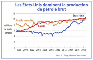 ![]() | La production américaine de pétrole a doublé entre 2008 et 2014. Depuis 2018, les Etats-Unis sont (re)devenus le premier producteur mondial de pétrole. Les Etats-Unis sont aussi redevenus un exportateur net de pétrole en 2018 (l’embargo sur les exportations a été levé en 2015). | ||
