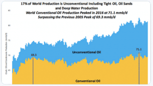 Attention à l’échelle : le graphique ne commence pas à zéro. | Depuis 2005, la production mondiale de pétrole dit « conventionnel » est sur une sorte de plateau. Depuis cette date, la croissance de la production mondiale est venue du pétrole « non conventionnel ». |