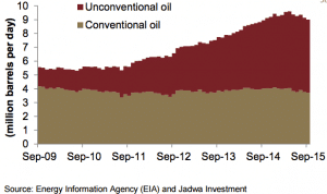 ![]() | De 2011 à 2014, la production américaine de pétrole a doublé, du fait de la mise en production de pétrole non conventionnel. NB : la baisse visible en fin de graphique en 2015 a été temporaire (voir graphique suivant). | ||